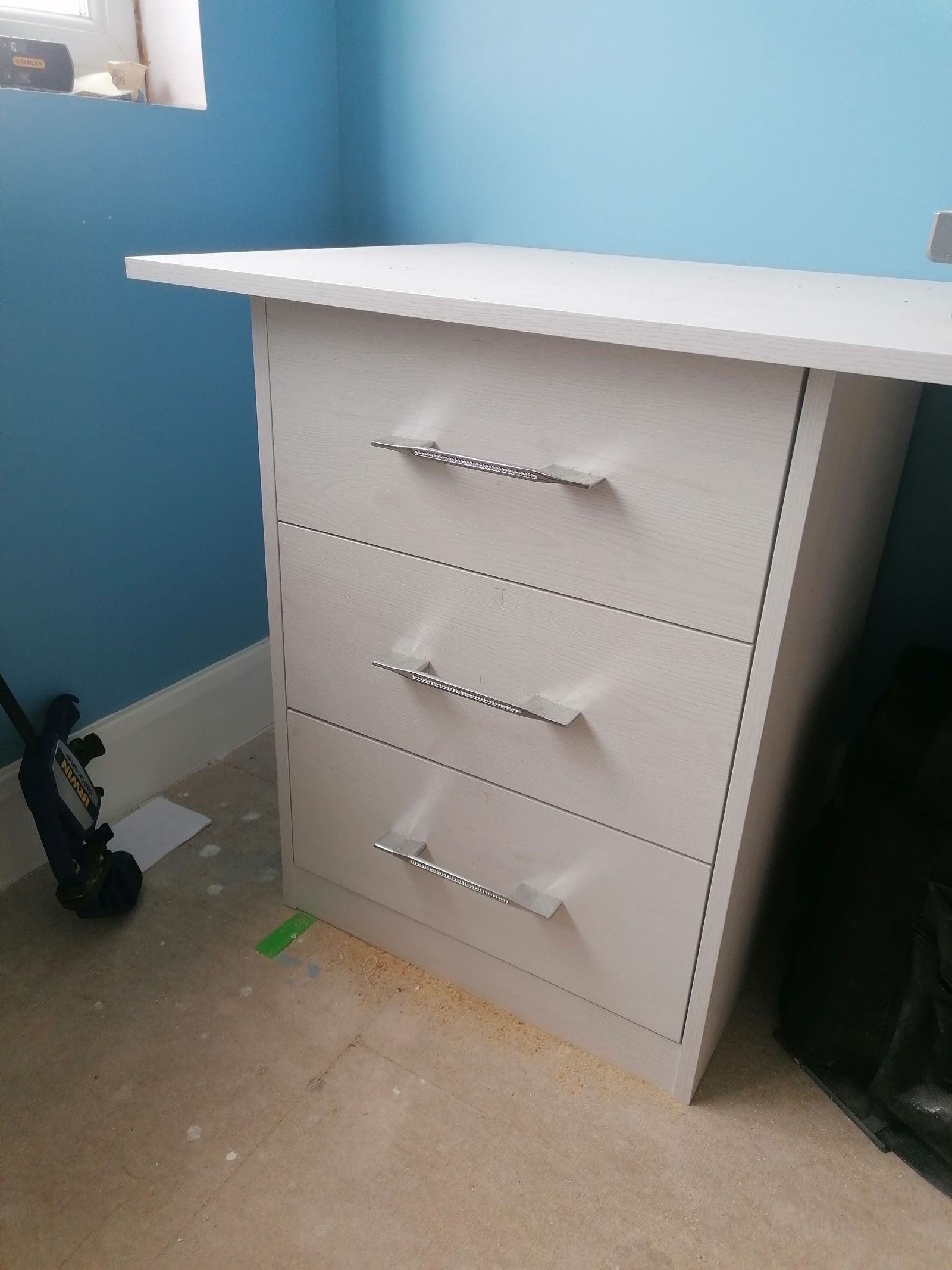 We used a white wood grain furniture board throughout, keeping the palette bright and neutral while adding subtle texture and warmth. Every piece was cut to size to make the most of the room’s dimensions — from the built-in wardrobe and drawer units to the low-profile desk and floating shelves. Bespoke diamond-effect handles added a touch of sparkle and personality, giving the furniture a playful but refined finish.